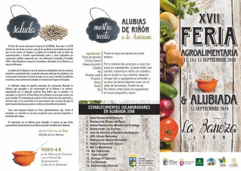 La Feria Agroalimentaria tendrá su culmen el domingo día 15 con la celebración de la tradicional alubiada popular. El menú de este año estará compuesto por alubias a la bañezana en cazuela de barro, lomo a la plancha con pimientos y de postre unas deliciosas tejas de almendra del artesano pastelero Peñín. Todo al precio de 4€ por persona. Los tickets para la alubiada se podrán adquirir en la oficina de turismo hasta el jueves día 12 y durante todo el fin de semana en el stand de turismo instalado en la Plaza Mayor.