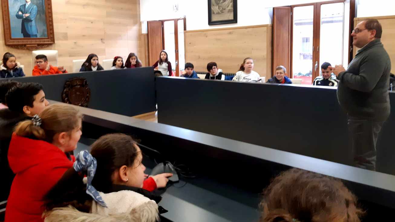Tras la visita de la exposición, los escolares se acercaron al Salón de Plenos del Ayuntamiento, donde fueron recibidos por el Alcalde de La Bañeza, Javier Carrera, quien explicó a los alumnos brevemente las competencias y el funcionamiento de la Administración Local.