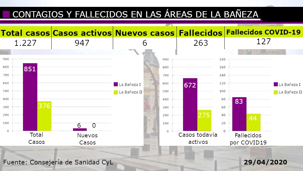 En la Zona Básica de Salud de La Bañeza I [CONTAGIADOS (851) CASOS ACTIVOS (672), FALLECIDOS (171) por COVID19 (83)] en los municipios;