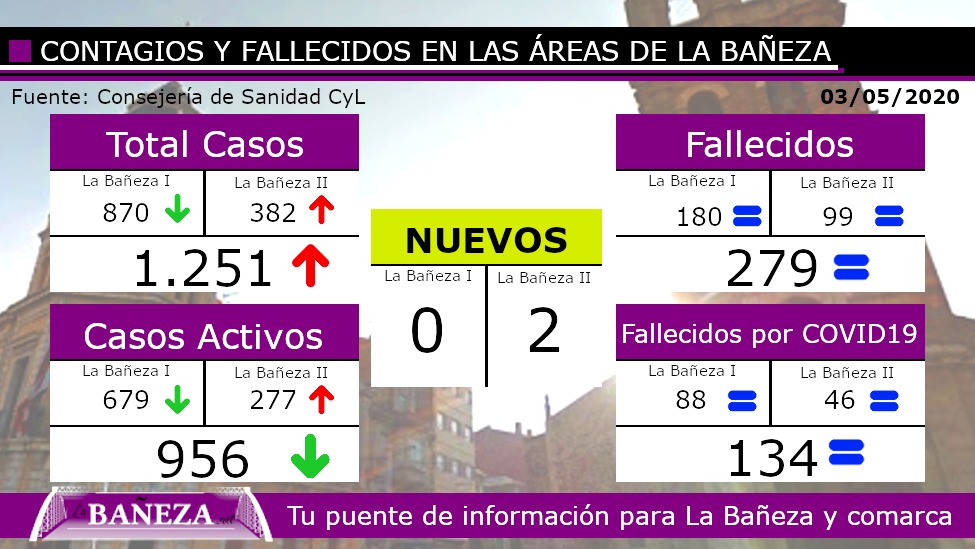 La nota negativa es la de los dos posibles contagios en el área de salud básica de La Bañeza II donde solo uno de los dos casos se suma a casos activos, un número de casos activos que desciende en tres contagios en La Bañeza I, pasando de 682 casos a 679 en esta zona. En cuanto al dato de mortalidad se estabiliza en las dos áreas haciendo un total de 279 personas fallecidas de las cuales según los datos facilitados por la Junta de Castilla y León son 134 los fallecidos por COVID-19.