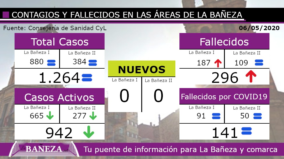 En la Zona Básica de Salud de La Bañeza II [CONTAGIADOS (384) CASOS ACTIVOS (277), FALLECIDOS (109) por COVID19 (50)] en los municipios;