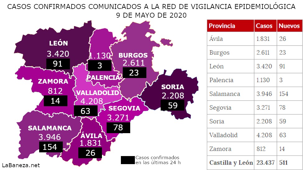 La situación recogida provincialmente puede consultarse en el archivo adjunto y de forma más amplia a través de este enlace al Portal de Transparencia de la Administración castellana y leonesa (SITUACIÓN EPIDEMIOLÓGICA DEL CORONAVIRUS (COVID-19) EN CASTILLA Y LEÓN).