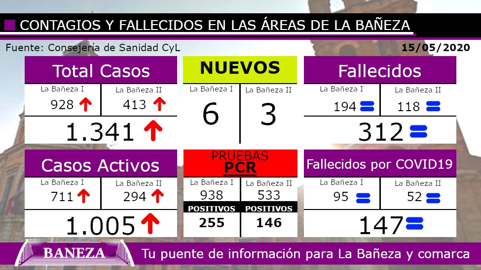 En la Zona Básica de Salud de La Bañeza I [CONTAGIADOS (928) CASOS ACTIVOS (711), FALLECIDOS (194) por COVID19 (95)] Pruebas PCR [Realizados: 938 - Positivos: 255] en los municipios;