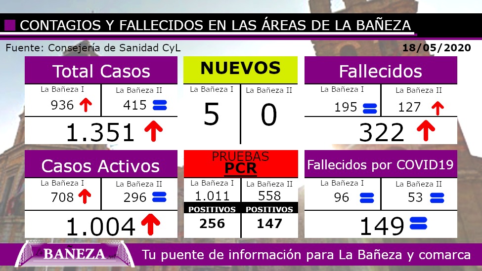En la Zona Básica de Salud de La Bañeza I [CONTAGIADOS (936) CASOS ACTIVOS (708), FALLECIDOS (195) por COVID19 (96)] Pruebas PCR [Realizados: 1.011 - Positivos: 256] en los municipios;