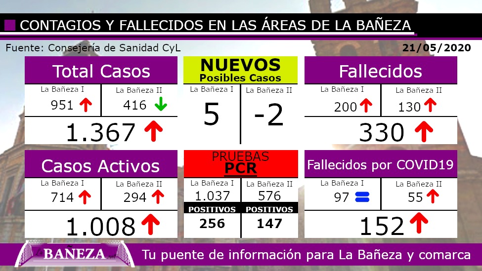 En los datos presentados hoy por la Consejería de Salud de Castilla y León, en ambas áreas de La Bañeza se registran dos nuevos casos activos, uno en cada zona, según estos datos el número de casos activos refleja las personas que se consideran aún enfermas según registros de su historia clínica, en cuanto a los posibles casos en el área dos disminuyen dos pacientes con sintomatología que parecía ser COVID-19 pero tras realizar las pruebas se descartan como posibles casos, en el área uno se registran cinco nuevos posibles casos a la espera de confirmación.