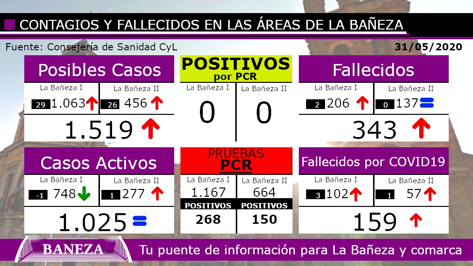 En los datos del día de hoy, ofrecidos por la Consejería de Sanidad, se observa un aumento de casi 30 posibles casos en cada una de las dos áreas de salud, en La Bañeza I 29 y en La Bañeza II 26. En las últimas 24 horas la zona I registró dos fallecidos pero se reflejan en estos datos tres defunciones positivas por COVID-19, además una más en la zona II.