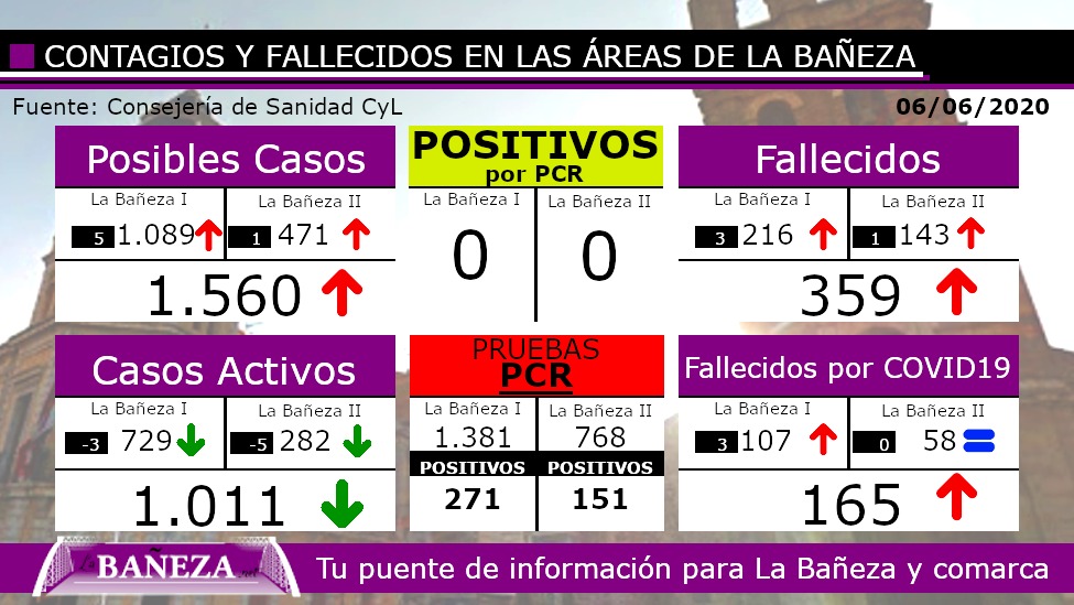 En el día de hoy los datos vuelven a ser bastante halagüeños, no se registran nuevos positivos por PCR y además descienden los casos activos hasta en 8 enfermos, la nota negativa es que se han registrado tres nuevos fallecidos por COVID-19, los tres casos en La Bañeza I.