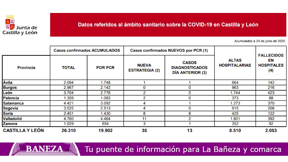 Castilla y León registra hoy 35 nuevos casos de la enfermedad COVID-19, dos en la provincia de León, lo que sitúa su número actual en 26.310; de esa cifra, 19.902 tienen confirmación por PCR.