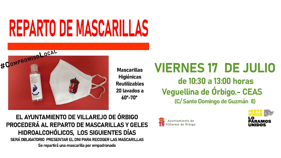 El pasado martes se realizó ya un primer reparto de mascarillas en el Ayuntamiento de Villarejo de Órbigo y ahora habilitará de nuevo el viernes 17 de Julio, de 10:30 a 13:00 horas, un punto de recogida de mascarillas higiénicas reutilizables, para todos aquellos empadronados que no hayan podido recogerlas.