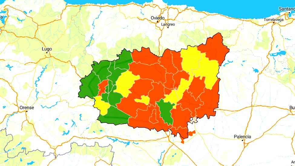 En La Bañeza II pasan de cinco casos a nueva, cuatro más que en el día de ayer y deja de estar en "amarillo" a teñirse de naranja, por lo que un 8,53% de personas del área tienen una PCR positiva por cada 10.000 tarjetas sanitarias, una zona en la que también se pide desde la Consejería restringir al máximo el contacto social y evitar reuniones de más de 10 personas, así como limitar al máximo la exposición en lugares cerrados.