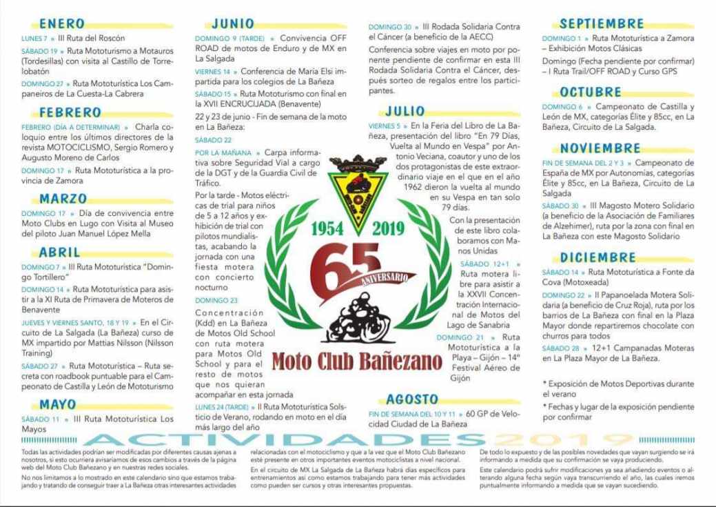 Cartel 60GP La BañezaEl Moto Club Bañezano presenta un calendario repleto de actividades para este 2019 tan especial, con motivo del 65 aniversario, no hay un mes para este año que no tengan ningún evento, destacando entre ellos el fin de semana del 10 y 11 de agosto el 60 Gran Premio de Velocidad Ciudad de La Bañeza.