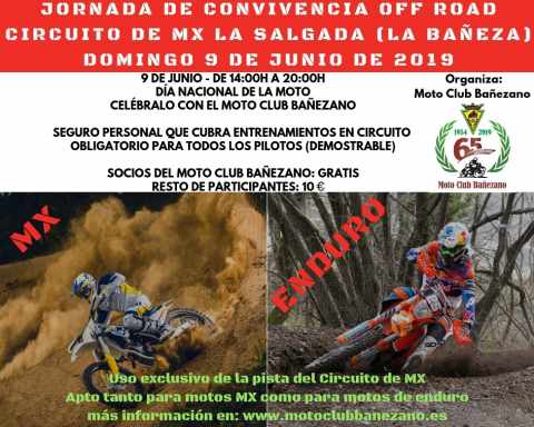 Este próximo domingo 9 de junio el Moto Club Bañezano celebra el Día Nacional de la Moto, y por ello han organizado una jornada de convivencia OFF ROAD para que los aficionados que quieran puedan rodar en un circuito de MX de máximo nivel. Se podrá participar en esta actividad tanto con motos de MX como con motos de Enduro.