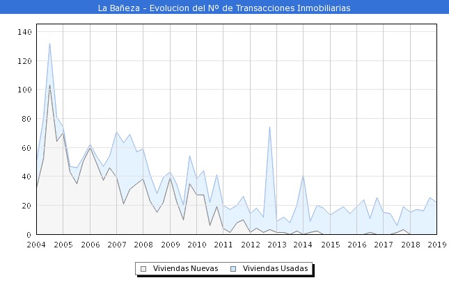La compra de vivienda nueva en La Bañeza lleva en decadencia desde 2012, ya cuatro años antes (2008) se notó una gran caída siendo el sector predominante las transacciones de segunda mano, pero el gran golpe de efecto se notó en 2013 cuando más de 80% de las transacciones fueron de segunda mano, en total 77 transacciones frente a cerca de una decena de nueva adquisición.