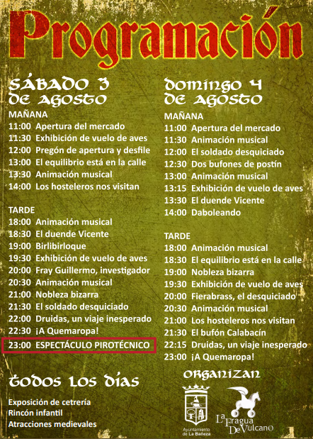 Dentro del programa de la presente edición del Mercado Medieval de La Bañeza, el espectáculo pirotécnico finalmente no tendrá lugar en la noche del sábado día 3 de agosto (comunicado Ayuntamiento) pero las exhibiciones de cetrería y otros espectáculos continúan dentro del programa del Mercado Medieval, así como los tradicionales puestos de artesanía y alimentación que, por unos días, transformarán el centro de La Bañeza en una clásica población medieval.