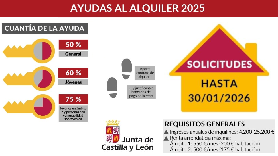 La Junta de Castilla y León mantiene abierto hasta el 30 de enero el plazo para solicitar las ayudas al alquiler de vivienda correspondientes al año 2025, una convocatoria destinada a facilitar el acceso y mantenimiento de la vivienda en régimen de alquiler o cesión de uso a personas con recursos económicos limitados en la Comunidad.