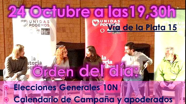 Este jueves 24 de octubre Podemos La Bañeza ha organizado una asamblea en su sede situada en la Vía de la Plata, 15 con la vista puesta en las elecciones del 10N, además se tratarán temas relacionados con el Pleno Municipal, el realizado el viernes pasado y se preparará el siguiente pleno de noviembre.