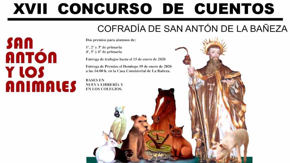 La cofradía de San Antón de La Bañeza convoca la decimoséptima edición del concurso de cuentos sobre animales en el cual podrán participar los alumnos que estén cursando estudios en los colegios de la ciudad y de la comarca. Así, se establecen dos premios, uno para los alumnos del 1º, 2º y 3º de Primaria y otro para los estudiantes de 4º, 5º y 6º.