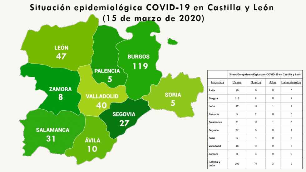 La Consejería de Sanidad ha confirmado, desde la última comunicación pública, 71 nuevos casos de infección por SARS-CoV-2, con lo que el número total de afectados alcanza los 292 en Castilla y León; asimismo se han producido cuatro nuevos fallecimientos, dos en Burgos, uno en León y el cuarto, en Salamanca.
