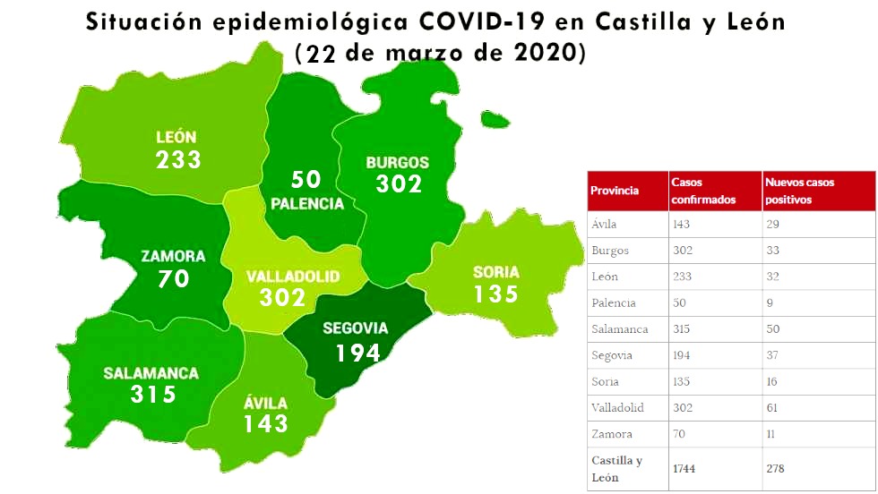La Consejería de Sanidad ha confirmado a las autoridades sanitarias nacionales, desde la última comunicación pública, 278 casos más de infección por SARS-CoV-2, con lo que en Castilla y León se registran 1.744 positivos.