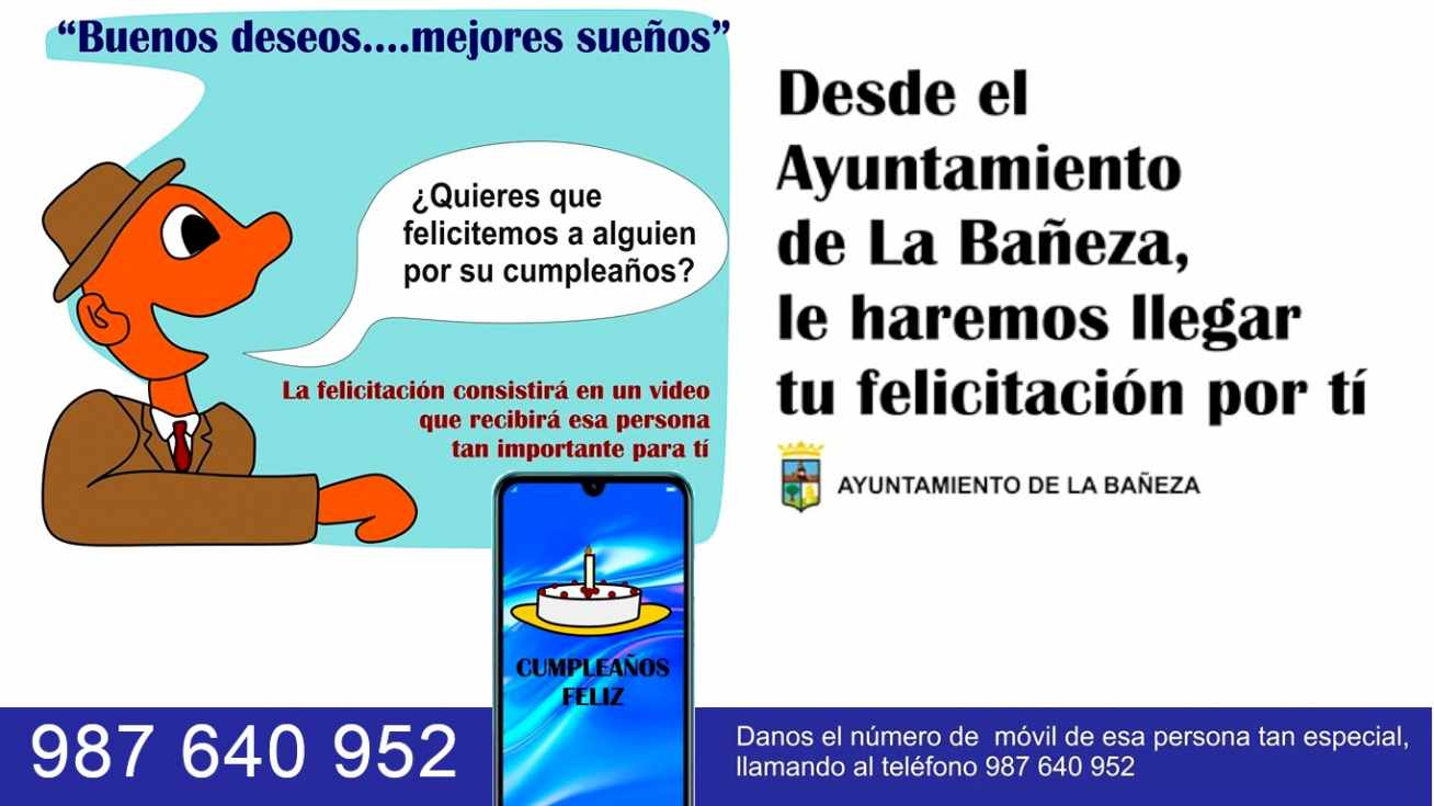 Desde el consistorio bañezano lanzan una iniciativa para felicitar a los cumpleañeros que les pille en este confinamiento que estamos viviendo, como se está haciendo en otras poblaciones, si deseas que alguna persona especial para ti sea felicitada y le animen en su día especial te puedes poner en contacto con el Ayuntamiento.