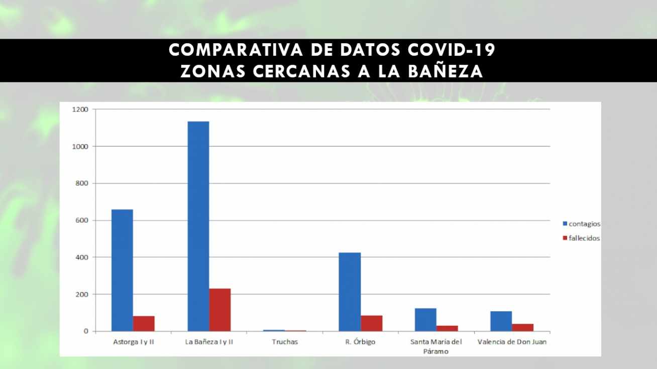 Entre las zonas básicas de salud que rodean a La Bañeza, los datos también son poco favorables, aunque las zonas bañezanas son las que mayor número de contagios y fallecidos acumula sin duda, la zonas de Astorga le siguen contando con un total ya registrado de 657 personas contagiadas y 82 fallecidos, seguidos de la zona del Órbigo con 424 contagiados y 84 fallecidos, en la otra cara de la moneda se encuentra la zona de Truchas con unos datos muy alentadores para una comarca en su totalidad bastante mayor y población reconocida de riesgo con 8 contagios y 1 fallecido hasta el momento.