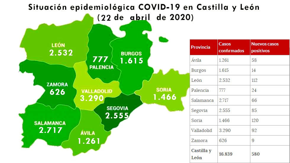 La Consejería de Sanidad ha confirmado a las autoridades sanitarias nacionales 580 nuevos positivos en infección por SARS-CoV-2, lo que sitúa el número actual de casos por la COVID-19 en 16.839, la provincia de León sufre un repunte con 112 nuevos casos registrados en el día de hoy.