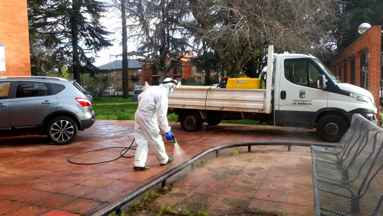 Continúan las tareas de desinfección iniciadas semanas atrás con recurso a personal y medios propios del Ayuntamiento de La Bañeza. Estos trabajos se están llevando a cabo de forma individualizada con el apoyo de vehículos municipales o bien con pulverizadores de mochila, permitiendo enfocarse de esta manera en aquellas zonas de difícil acceso, como son el interior de los soportales y el mobiliario urbano presente en nuestras calles.