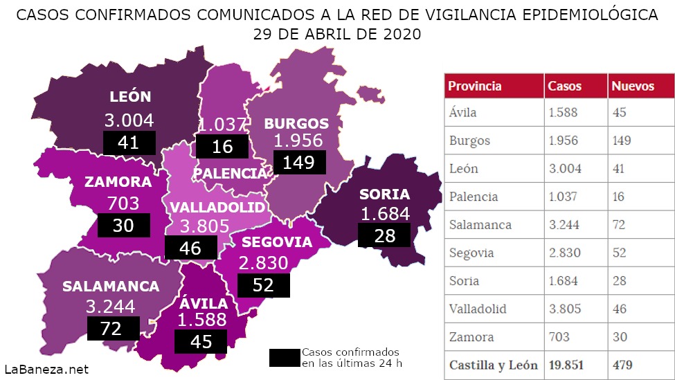 La situación recogida provincialmente puede consultarse en el archivo adjunto y de forma más amplia a través de este enlace al Portal de Transparencia de la Administración castellana y leonesa Enlace a la información actualizada sobre el nuevo coronavirus COVID-19 en Castilla y León, en donde también están accesibles estadísticas sobre profesionales sanitarios afectados por la epidemia.