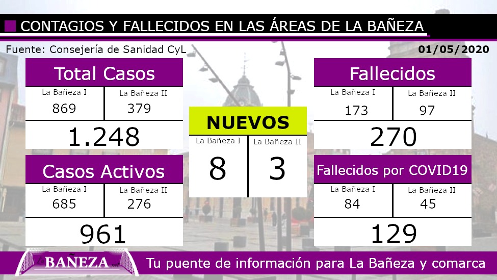 En las últimas 24 horas el área básica de salud de La Bañeza II ha sumado 3 nuevos casos, después de dos días sin ningún incremento, además en el mismo área se han contabilizado tres decesos de los cuales solo uno se certifica como fallecimiento por COVID-19. En La Bañeza I se registran el resto de contagios, en total 8, mientras que el dato de muertes por coronavirus no suma.