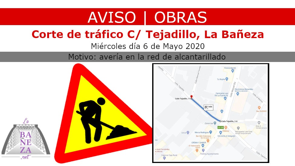 La ConcejalÃa de Obras del Ayuntamiento de La Bañeza informa de que debido a una averÃa en la red de alcantarillado de la Calle Tejadillo, esta permanecerá cortada al tráfico desde mañana miércoles dÃa 6 de mayo.