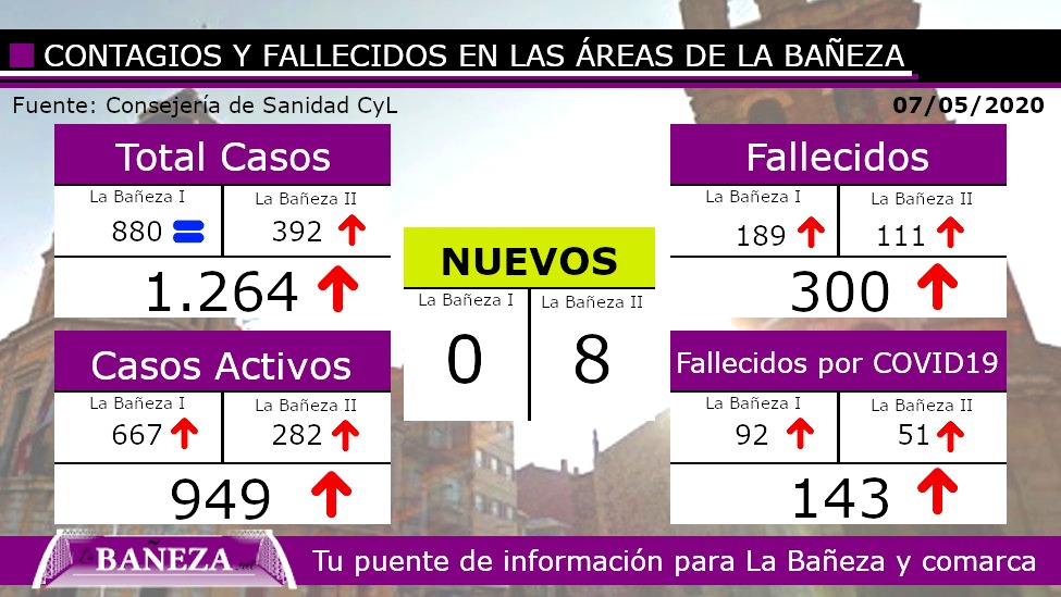 En la Zona Básica de Salud de La Bañeza II [CONTAGIADOS (392) CASOS ACTIVOS (282), FALLECIDOS (111) por COVID19 (51)] en los municipios;