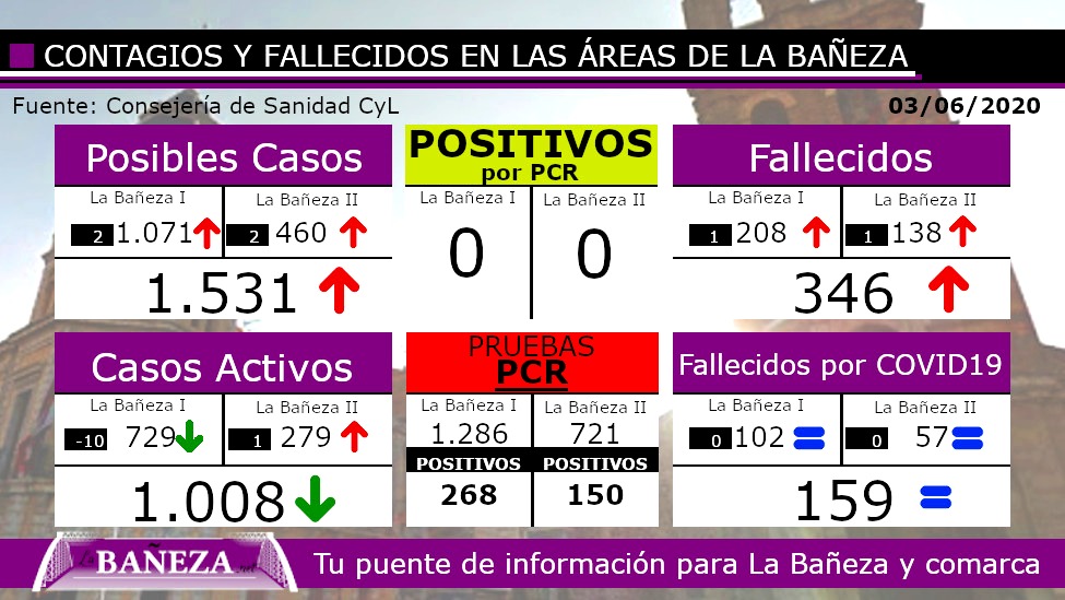 Por tercer día consecutivo La Bañeza, en ninguna de sus dos áreas básicas de salud, ha sumado positivos por PCR, además tampoco suma fallecidos por COVID-19 y descienden sus casos activos, pero si continúan subiendo los posibles casos, los cuales se refieren a enfermos con algún tipo de patología similar al coronavirus, (tos, fiebre, dolor de garganta...).