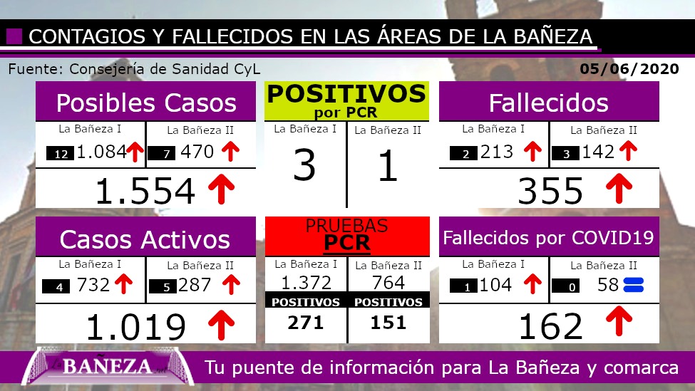 En el día de hoy en las áreas de La Bañeza se registran cinco fallecidos de los cuales, 2 en La Bañeza I y 3 en La Bañeza II, solo se ha verificado como fallecido por COVID-19 uno y ha sido en el área principal de la localidad.