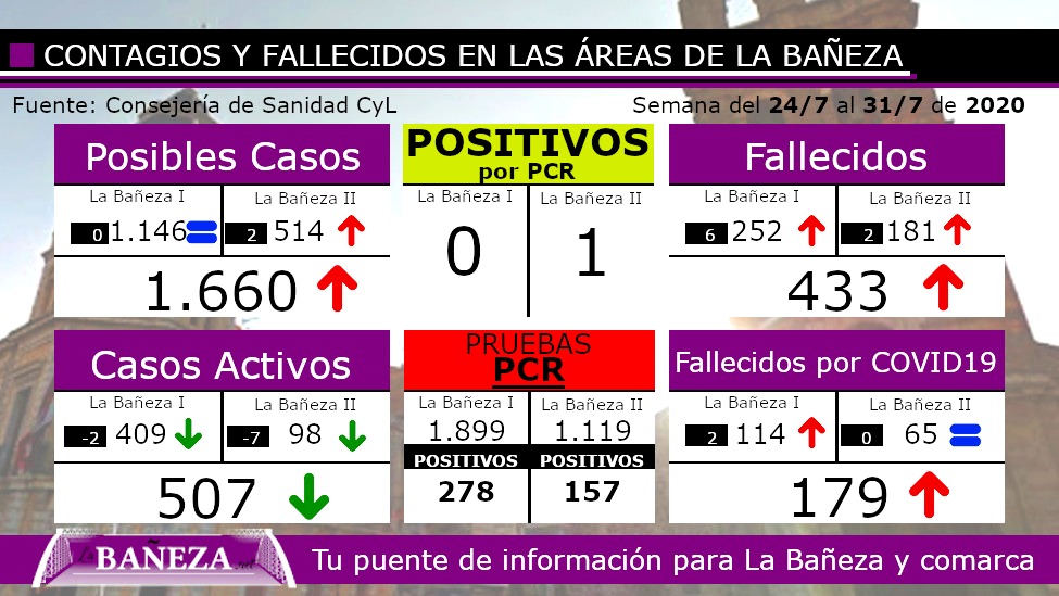 Entre las dos áreas de salud que engloba La Bañeza y su comarca, en los últimos 7 días, solo se ha registrado un positivo por PCR, según la Consejería de Sanidad de Castilla y León, este caso se ha dado en la comarca, al igual que los posibles casos que solo suben en este mismo área básica de salud de La Bañeza II con dos personas enfermas con síntomas similares al COVID-19 pero sin ser aun confirmados.