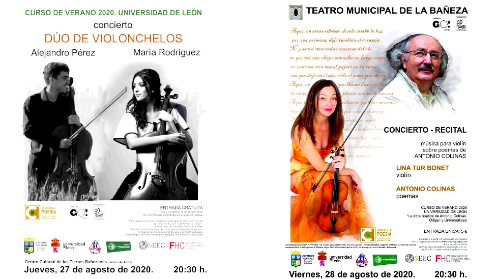 Destacar que durante estos días, al hilo de este curso, la ciudad está celebrando eventos culturales que unen música y poesía. Y si ayer abrió la veda el recital ‘En boca de mujer’, hoy le toca el turno al dúo de cellos, Alejandro Pérez y María Rodríguez, y mañana clausurará la última velada el propio Colinas con sus versos, a los que les pondrá música Lina Tur Bonet, en el concierto-recital que tendrá lugar en el teatro bañezano, a las 20:30 horas.