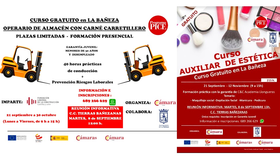 Los cursos son gratuitos y están organizados por la cámara de comercio de León, con la colaboración del Ayuntamiento de La Bañeza y la Fundación Laboral de la construcción de Castilla y León, para más información mañana martes 8 de Septiembre se realizará una charla informativa en el Centro Cultural Tierras Bañezanas, carretillero a las 12:00 y estética a las 13:00 horas.