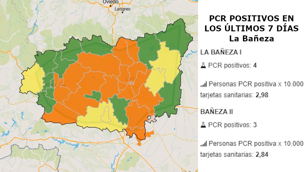 En La Bañeza II se mantiene en 3 casos, por lo que un 2,84% de personas del área tienen una PCR positiva por cada 10.000 tarjetas sanitarias, continuando hasta el momento en "amarillo" por lo que desde la Consejería de Sanidad se pide extremar las medidas de precaución y prevención, además aconsejan no realizar desplazamientos innecesarios.