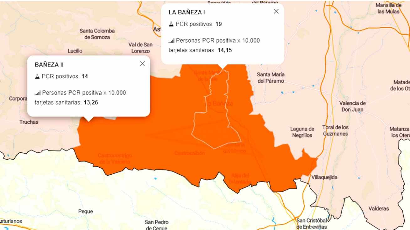 En La Bañeza I en el día de hoy se registra un total de 19 PCR positivos contabilizados en los últimos siete días, habiendo un 14,15% de personas con un PCR positivo por cada 10.000 tarjetas sanitarias, esta zona continúa en nivel "naranja", por lo que desde Sanidad se pide restringir al máximo el contacto social y evitar reuniones de más de 10 personas así como limitar al máximo la exposición en lugares cerrados.