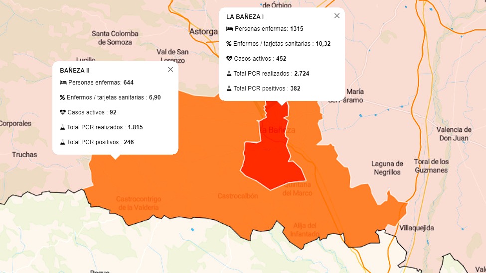 Según los datos registrados por la Consejería de Sanidad en La Bañeza I se contabilizan nueve casos menos que en el día de ayer, pasando de 461 a 452 casos activos, a día de hoy con un total se registran 19 pruebas PCR positivas en los últimos 7 días, mientras que La Bañeza II pasa de 87 casos activos a 92 con un total de 14 pruebas PCR positivas en los últimos 7 días.
