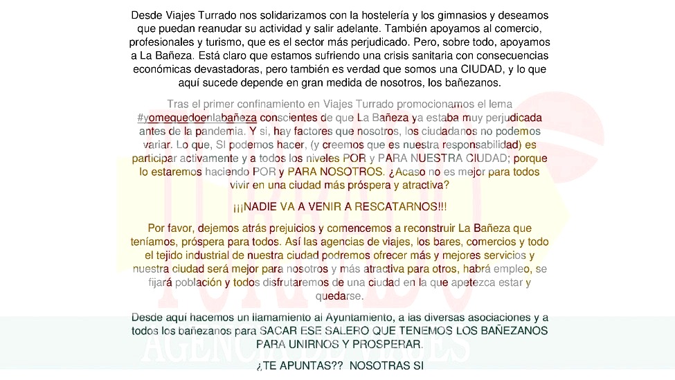Por eso desde la empresa bañezana de Viajes Turrada han realizado este manifiesto en el que piden unidad así como la participación activa de los ciudadanos para poder salir a delante de esta crisis económica, causada por esta crisis sanitaria, que está tocando a todos los sectores empresariales y sociales de manera directa o indirecta.