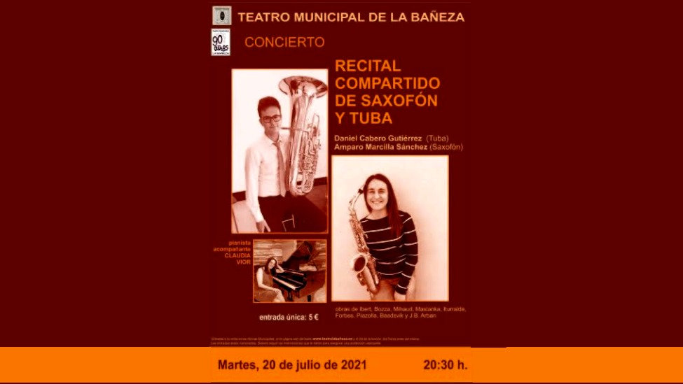 El Teatro Municipal bañezano acoge este martes, 20 de julio, un concierto-recital compartido de tuba y saxofón, a cargo de los intérpretes Daniel Cabero y Amparo Marcilla, respectivamente, y con Claudia Vior como pianista acompañante. El repertorio será variado, incluyendo obras de músicos como Ibert, Bozza, Milhaud, Iturralde o Maslanka, entre otros. En cuanto a los géneros musicales, se interpretarán piezas de la música popular argentina, tangos, variaciones, obras minimalistas y hasta un carnaval.