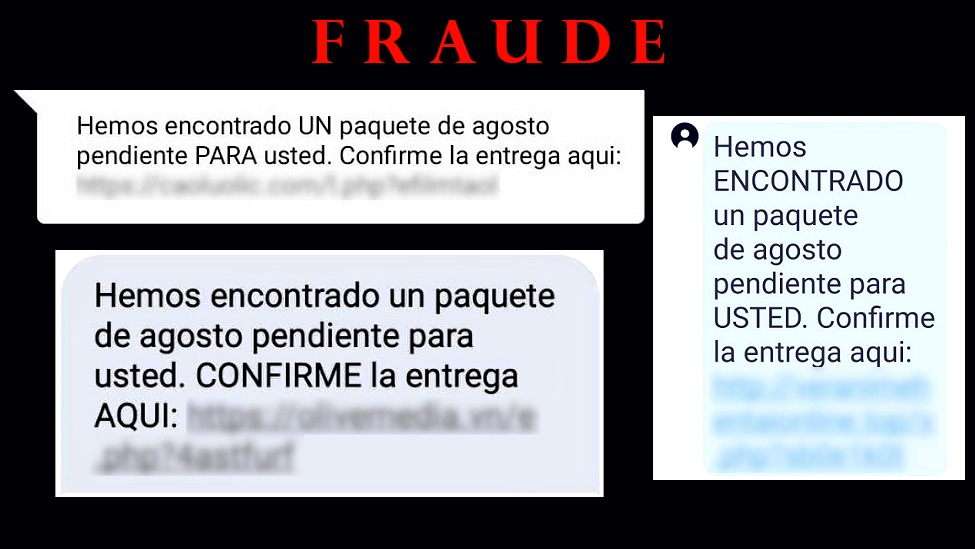 Cabe destacar que el texto del mensaje contiene faltas de ortografía, como la ausencia de tildes y utiliza palabras en mayúscula de forma aleatoria en cada mensaje. El mensaje puede contener algo como ‘Hemos encontrado UN paquete de agosto pendiente PARA usted. Confirme la entrega aqui:’.