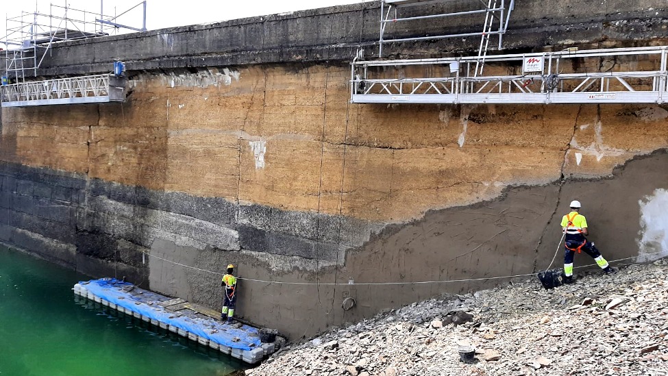 Por otra parte, los trabajos de impermeabilización del paramento de aguas arriba implicaron diversas etapas, como la limpieza de la superficie con agua a presión, la regularización del paramento mediante mortero, el tratamiento de juntas y el revestimiento con un mortero cementoso impermeable en dos capas. Estas labores, realizadas desde plataformas colgadas desde la coronación de la presa, buscan asegurar la integridad estructural.