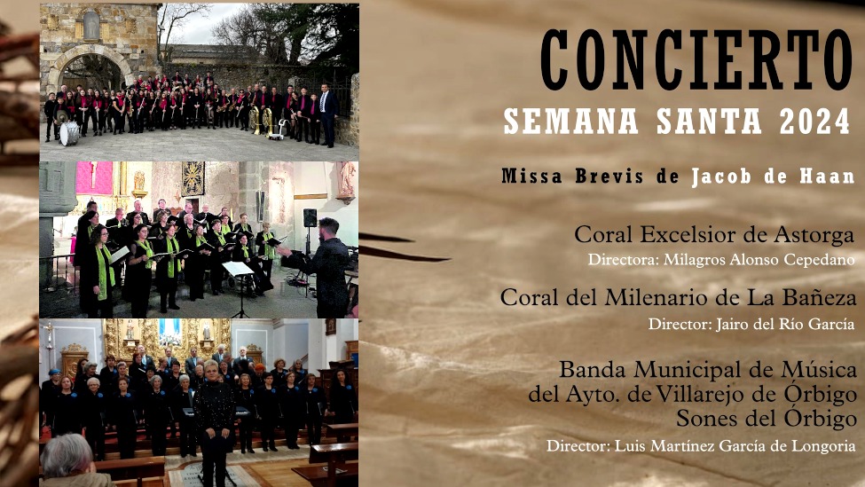 La Banda Municipal de Música Sones del Órbigo, bajo la dirección de Luis Martínez García de Longoria, ofrecerá un repertorio especialmente seleccionado para la ocasión, que incluirá marchas de Semana Santa y la Missa Brevis del renombrado compositor holandés Jacob de Haan. Destacando la colaboración de dos destacadas corales en la interpretación de esta obra maestra: la Coral Excelsior de Astorga, dirigida por Milagros Alonso Cepedano, y la Coral del Milenario de San Salvador de La Bañeza, bajo la dirección de Jairo del Río García.