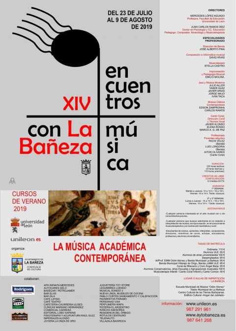 El curso incluido en la oferta estival del programa UNILEÓN 2019 propiciará que La Bañeza se convierta durante tres semanas en una de las ciudades más dinámicas en el aspecto cultural. El ciclo cuenta ya con 80 alumnos matriculados y mantienen abierto el plazo de inscripción, que puede formalizarse a través de la web de la ULE. Dirigido por Mercedes López Aguado, profesora de la Facultad de Educación de la ULE y el compositor y musicólogo Juan Carlos Ramos Díez, el programa está destinado a alumnos universitarios, músicos, artistas, profesionales y resto de personas interesadas.